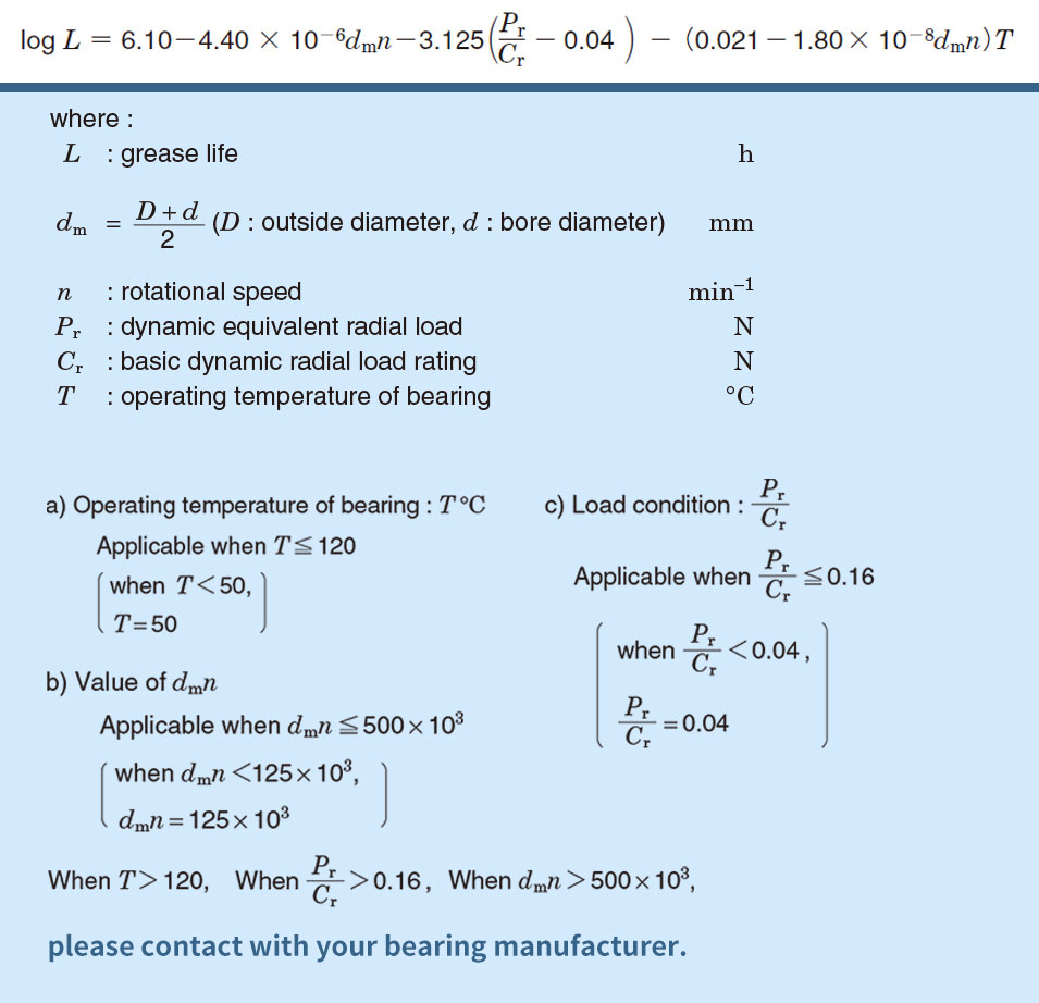 另一方面,在考慮軸承潤滑頻率的同時,準(zhǔn)確估計潤滑劑的壽命是至關(guān)重要的,對于填充有潤滑脂的密封單列深溝球軸承,潤滑脂壽命可以使用如上公式進行估計。