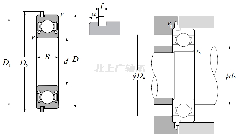 | 單列向心球軸承 - 雙面密封(輕接觸式橡膠密封),帶卡環 - 尺寸 | |