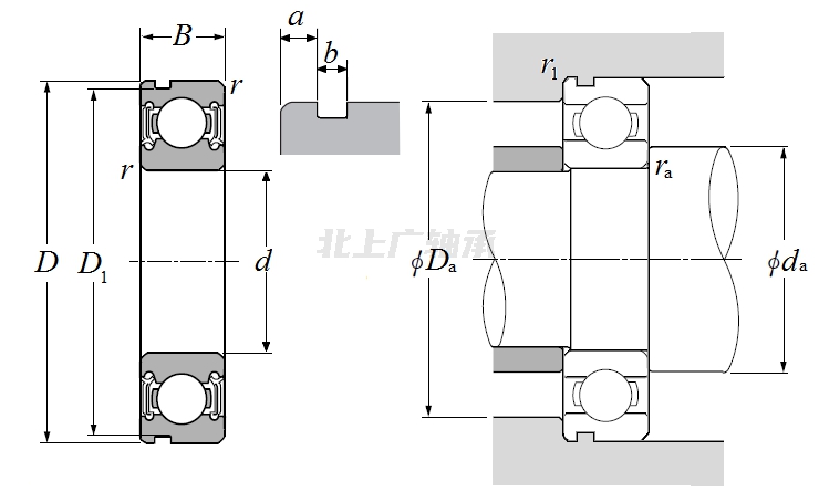 | 單列向心球軸承 - 雙面密封(接觸式橡膠密封),帶卡環(huán)槽 - 尺寸 | |