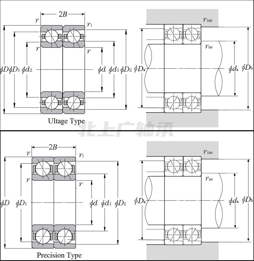| 雙聯(lián)角接觸球軸承 - 串聯(lián)配對 - 尺寸 | |