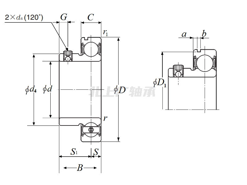 | 帶座軸承,帶固定螺釘,窄內圈 - 圓柱外圈,帶卡環槽 - 尺寸 | |