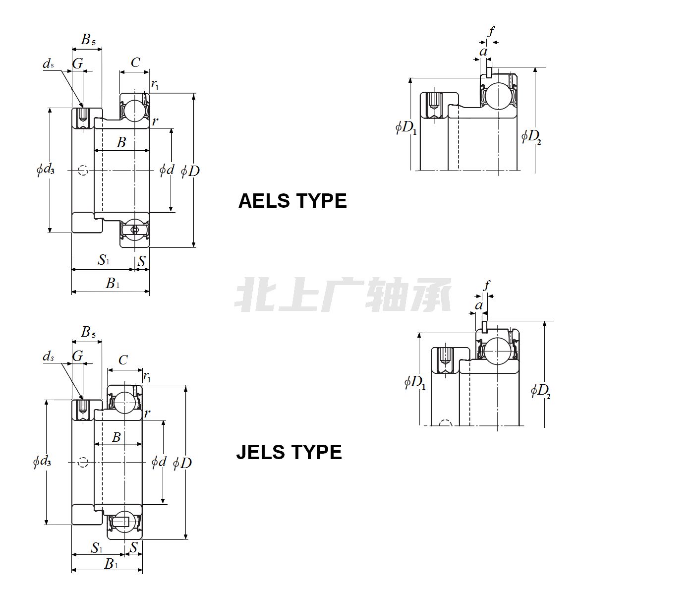 前綴列表:【AEL:AL 系列外球面球軸承 + EL 偏心套圈】【S:外圈外表面為圓柱形】,后綴列表:【NR:帶止動環(huán)和止動槽】