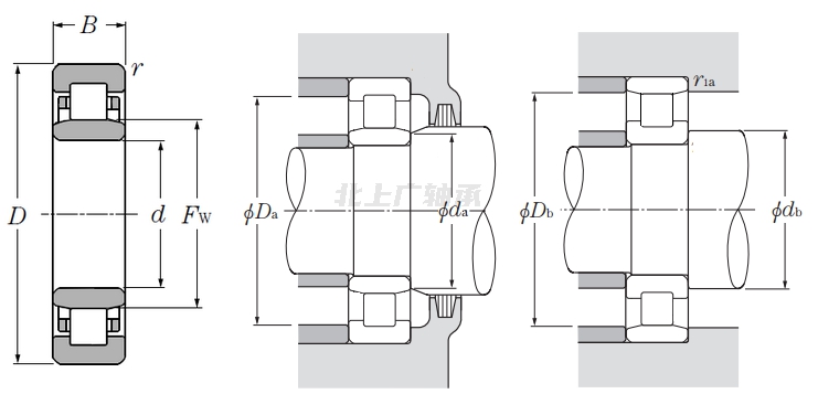 | 圓柱滾子軸承 - 可分離,普通內圈,外圈帶兩個側肋 - NU型 - 尺寸 | |