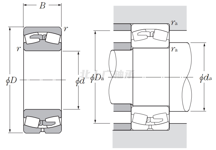 | 標準孔徑調(diào)心滾子軸承,239系列 - 尺寸 | |