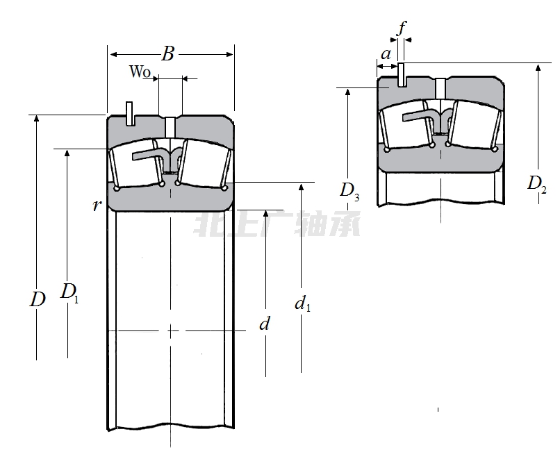 | 調心滾子軸承,帶卡環(huán) - 尺寸 | |
