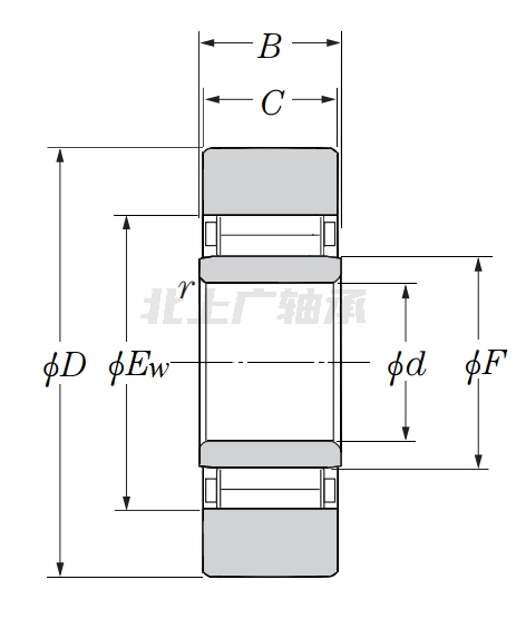 前綴列表:【NA:滾動體為滾針】【CV:英制尺寸的滿裝滾子滾輪軸承】,后綴列表:【X:外圈表面為圓柱形】