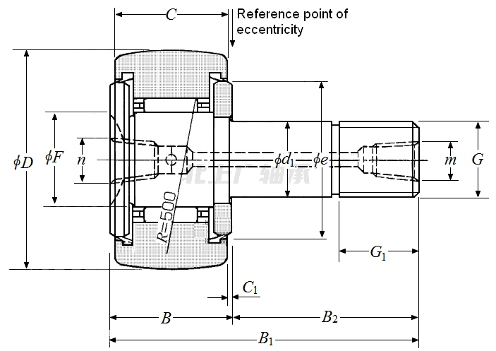 前綴列表:【KR:公制凸輪從動軸承(螺栓滾輪軸承)】【V:滿裝滾子型】,后綴列表:【X:圓柱形外圈表面】【LL:兩側帶接觸式黑色合成橡膠密封件】【H:與 SK 同,螺柱型凸輪從動件,帶六角孔】