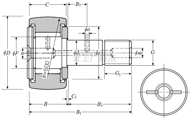 前綴列表:【KR:公制凸輪從動軸承(螺栓滾輪軸承)】【V:滿裝滾子型】【T:帶潤滑油孔】,后綴列表:【X:圓柱形外圈表面】