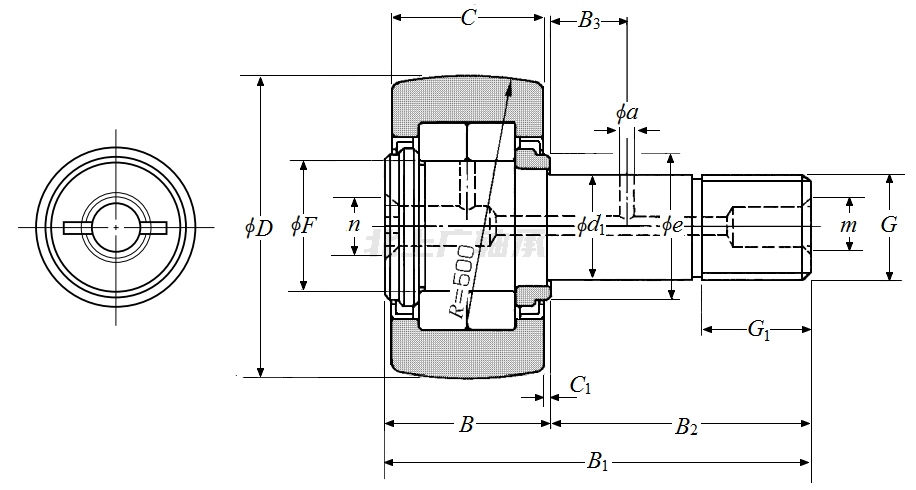 | 凸輪從動件,螺柱型履帶滾子軸承 - 球面外圈,NUKR型 - 尺寸 | |