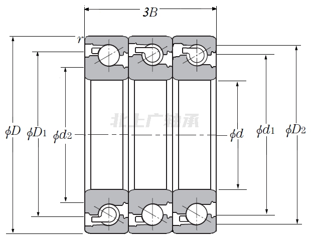 前綴列表:【BST:滾珠絲杠用角接觸推力球軸承】,后綴列表:【-1B:標準預緊】【DFT:三列 \ / / 配對】【P4:P4 級精度】