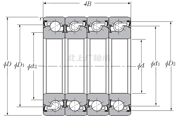 | 滾珠絲杠用四列角接觸推力球軸承 - DBTT 四列配對,雙面密封,三列承受軸向載荷 - 尺寸 | |