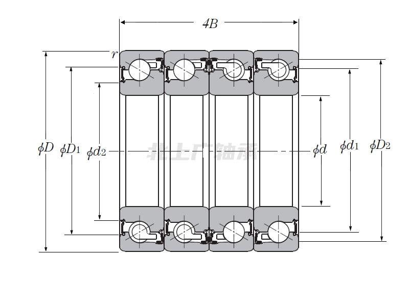 | 滾珠絲杠用四列角接觸推力球軸承 - 開式,兩列承受軸向載荷 - 尺寸 | |
