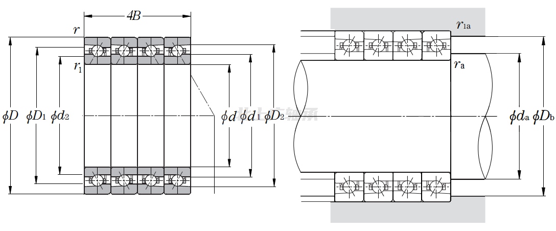 | 多列高轉(zhuǎn)速角接觸球軸承 - Ultage HSE型 - 尺寸 | |