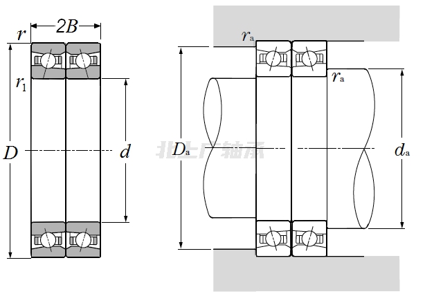 | 超高轉速雙聯角接觸球軸承,背對背配對 - 尺寸 | |