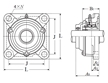 | 四螺栓方形法蘭式軸承座安裝單元,鑄造外殼,帶緊定套,鑄造防塵蓋,開式,UKF型 - 尺寸 | |