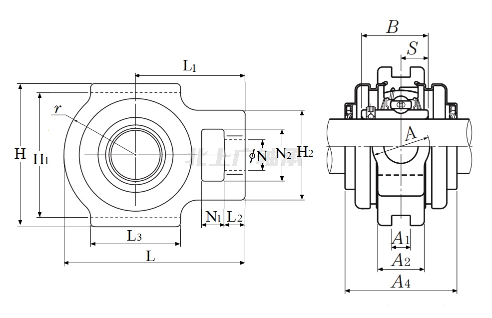 | 滑塊型軸承座,鑄造外殼,帶緊定螺釘,壓制鋼防塵蓋,開式,UCT型 - 尺寸 | |